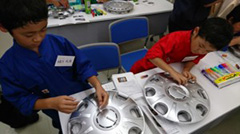 再び事務所2階に戻って工作の時間、ホイールカバーを利用した時計を作ります。